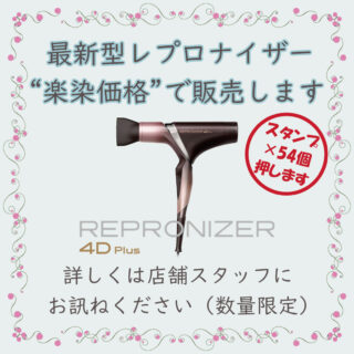 店販・セール情報 ☆ 店販 ☆ 最新型レプロナイザーを楽染価格で レプロナイザー4D Plus 公式サイト10月17日に発売されたレプロナイザー4D Plus(メーカー希望価格・税込60,500円)を特別価格で販売します。詳細は店舗にてご確認ください(店舗に在庫がない場合、取り寄せに数日いただきます)。 2025.11.21 店販・セール情報